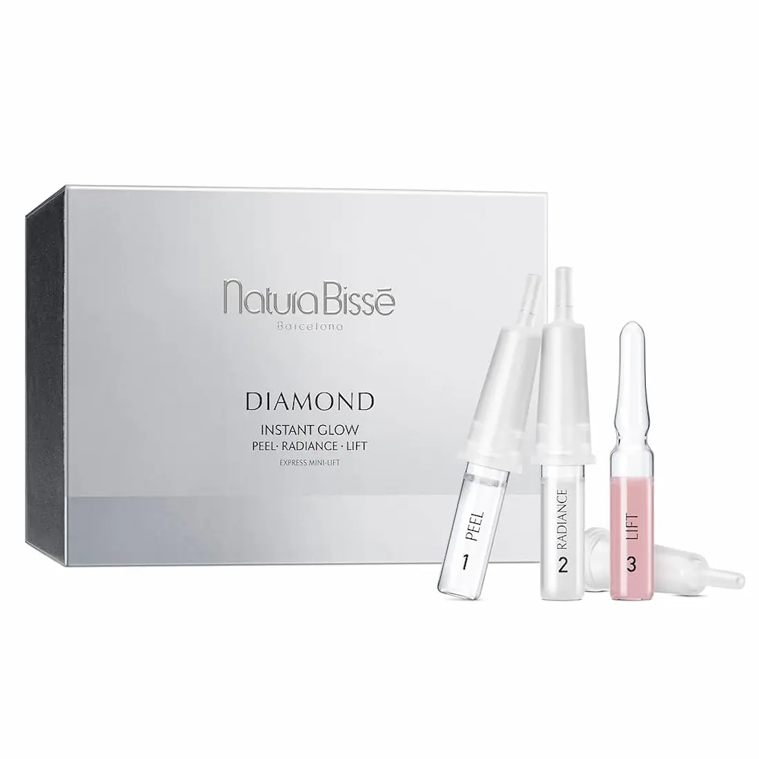 Diamond Instant Glow de Natura Bissé é um trio de ampolas para um tratamento facial de efeito lifting express. Este trio de cuidados antienvelhecimento atua para esfoliar, iluminar e proporcionar um efeito tensor – cada etapa deste tratamento corresponde a uma ampola. Em apenas 10 minutos este tratamento esfolia suavemente, uniformiza o tom da pele, suaviza rugas e linhas de expressão e restaura a elasticidade e o brilho natural da pele. Revitalize a sua tez com Diamond Instant Glow, um tratamento digno de Spa.