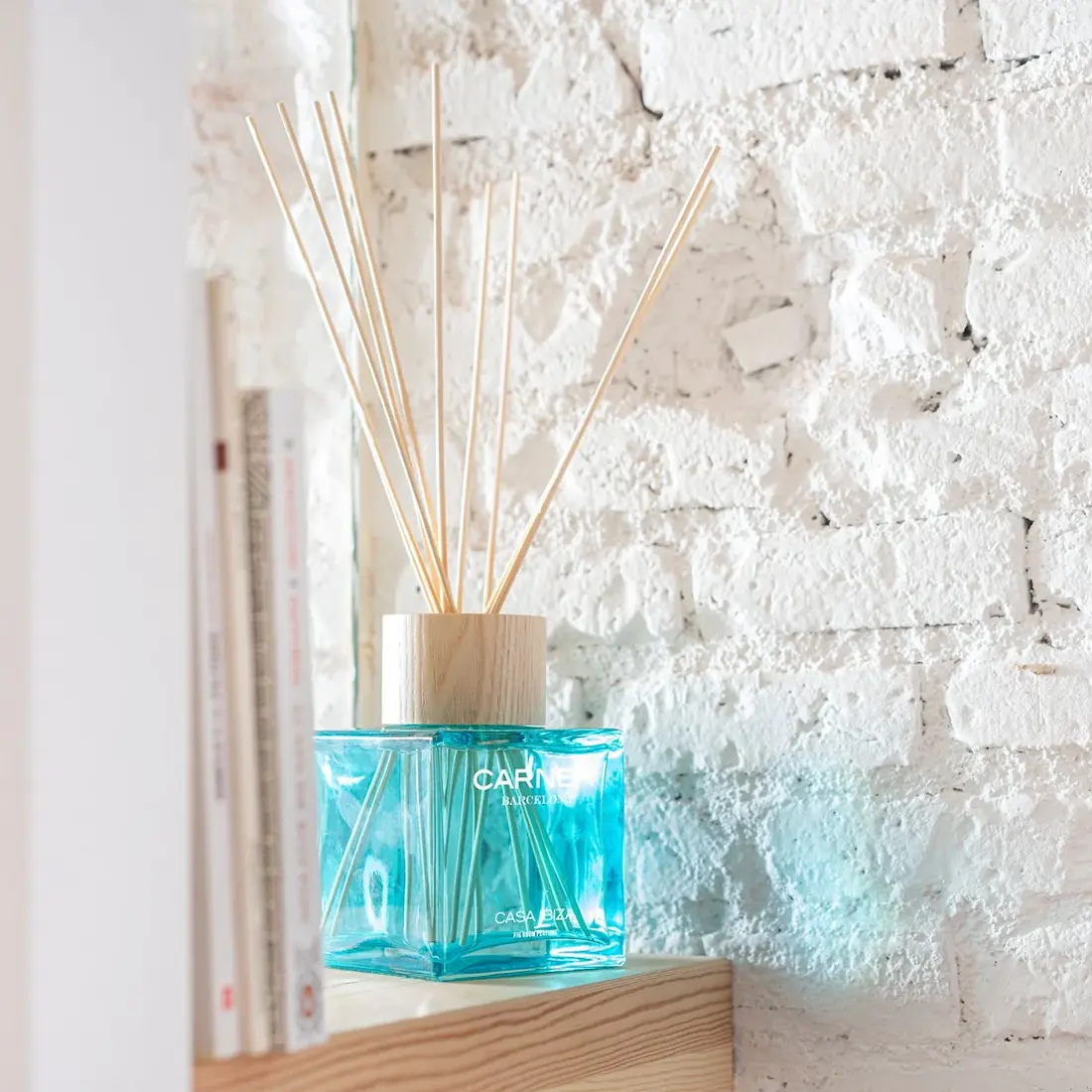 Sinta o aroma da figueira sob o calor do sol mediterrâneo, assinatura de Ibiza. O difusor de figo Carner Barcelona tem notas de folhas de figueira, patchouli e sândalo e irá refrescar instantaneamente qualquer ambiente. Os difusores transmitem um espírito mediterrâneo, não só olfativo, mas também visual, através de um elegante frasco de vidro de cor azul claro, da cor do mar. Eles são coroados com 10 palhetas de rattan natural e proporcionam um perfume constante até 4 meses. Disponível no tamanho 500 ml.