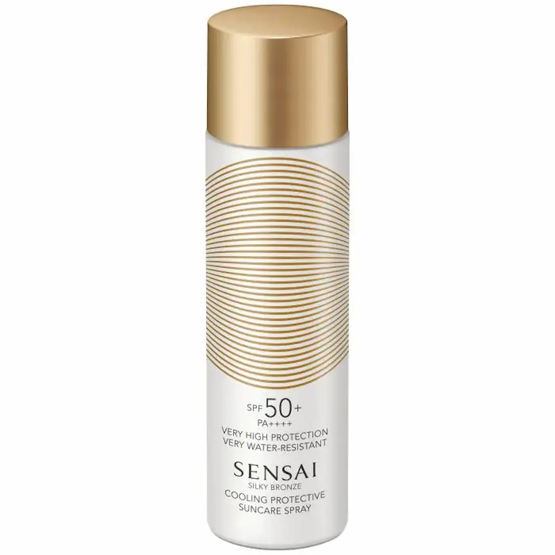 Silky Bronze Cool Protective Suncare de Sensai é um protetor solar em spray com SPF50+. Com elevada proteção e alta resistência à água, este spray protege o rosto e o corpo contra os raios UV enquanto combate os sinais visíveis de envelhecimento precoce da pele. A sua fórmula é refrescante e proporciona hidratação imediata à pele. Este spray envolve o corpo num véu de óleo leve e sedoso de alta proteção solar, ao mesmo tempo que deixa na pele um suave aroma de pêssego.